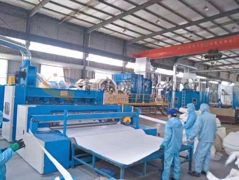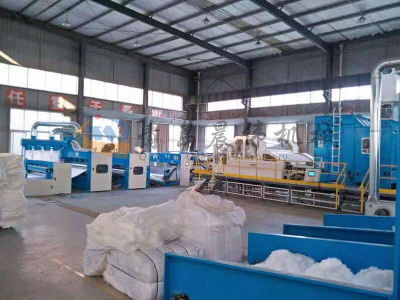 開(kāi)包機(jī)-開(kāi)松機(jī)-振動(dòng)給棉機(jī)-梳理機(jī)-鋪網(wǎng)機(jī)-針刺機(jī)-成卷切片機(jī)