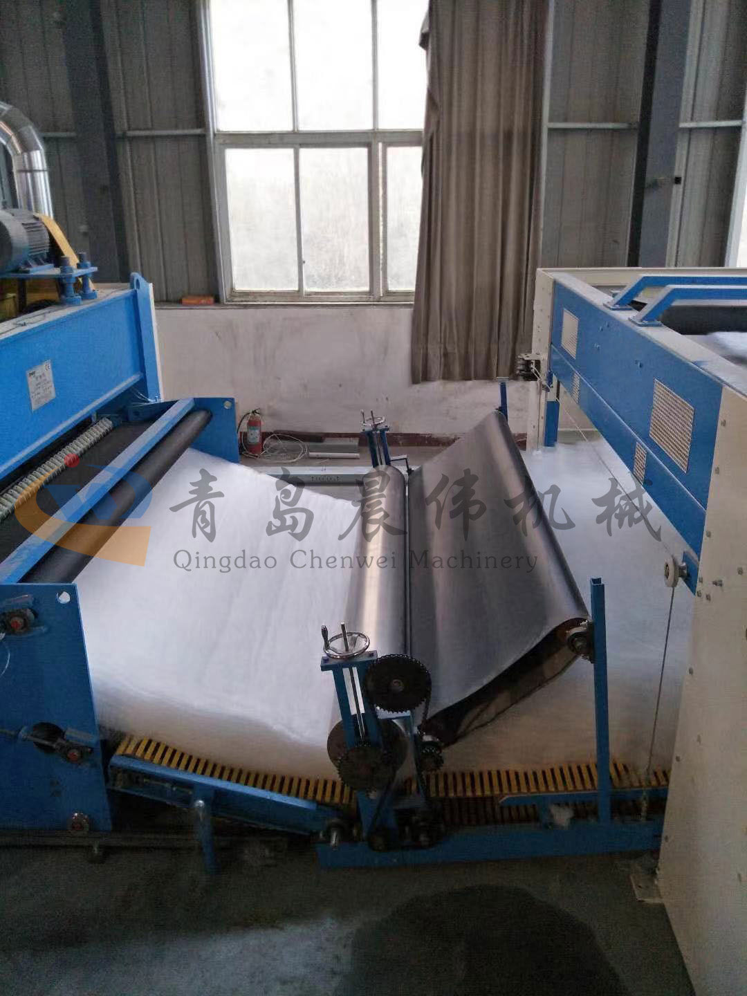 5. CWPW-鋪網(wǎng)機(jī):用于將梳理纖網(wǎng)通過(guò)移動(dòng)小車交叉折疊為所需幅寬和定量的多層纖網(wǎng),以供后道工序使用。鋪網(wǎng)輥采用特殊結(jié)構(gòu),加裝壓網(wǎng)輥和導(dǎo)流板,不飄網(wǎng)不起皺,五只大功率電機(jī)精確控制各部件的運(yùn)動(dòng),電動(dòng)輸出簾高度調(diào)節(jié)裝置