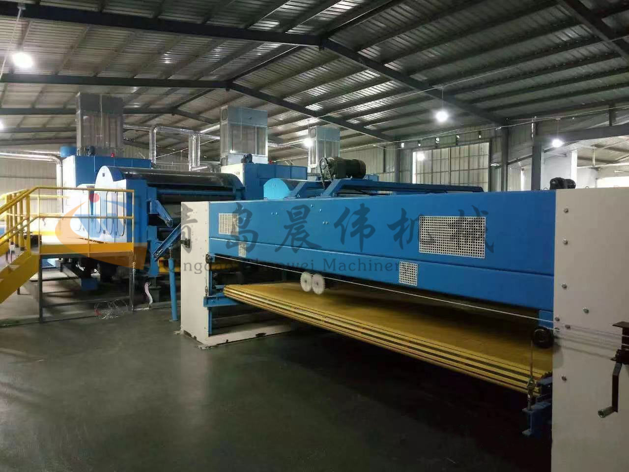 開(kāi)包機(jī)-開(kāi)松機(jī)-振動(dòng)給棉機(jī)-梳理機(jī)-鋪網(wǎng)機(jī)-烘房-燙光機(jī)-成卷切片機(jī)