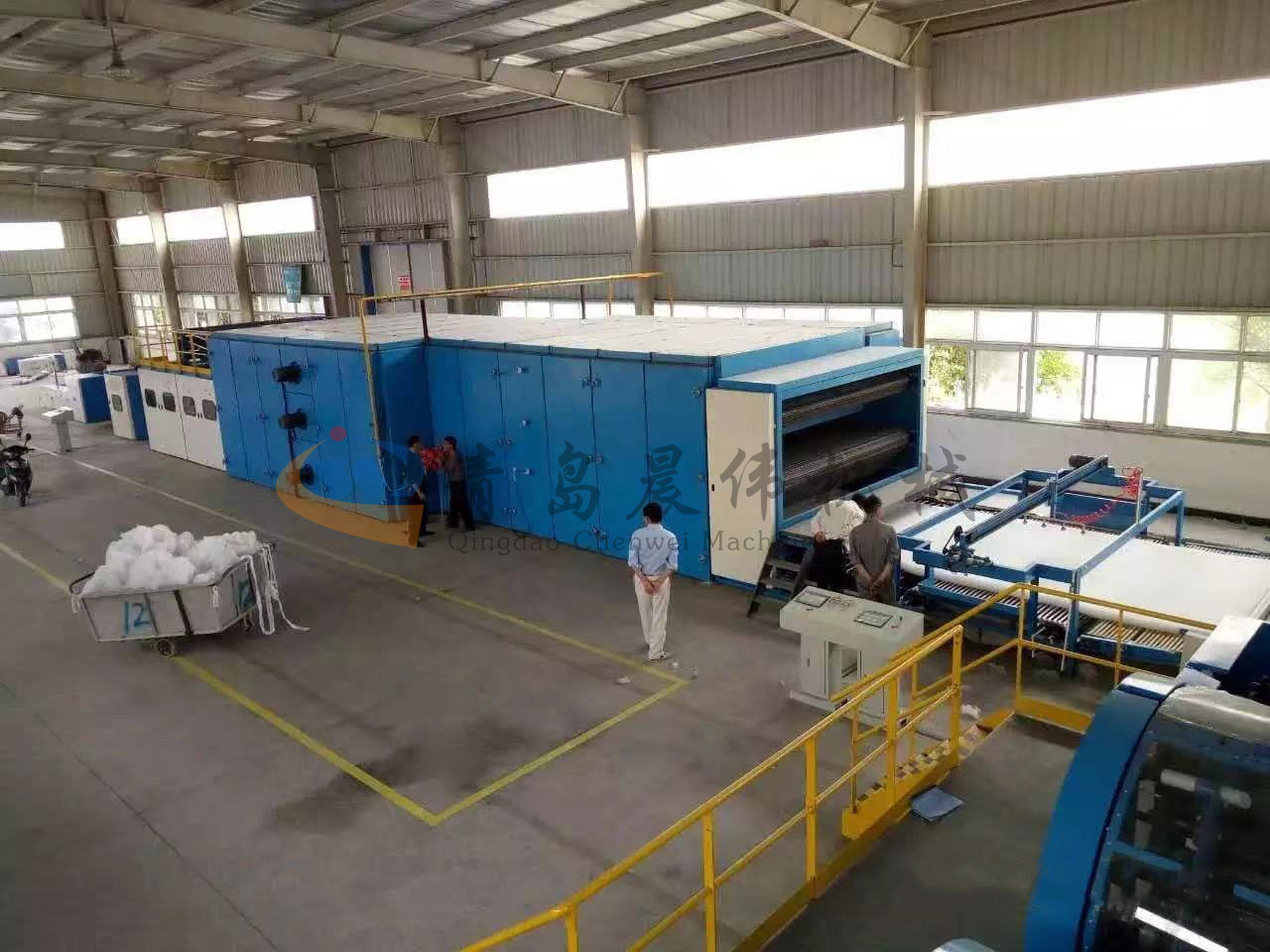 該生產(chǎn)線用于生產(chǎn)高檔家用紡織材料仿絲棉, 仿絲棉廣泛應(yīng)用于服裝、床上用品、家具等。根據(jù)客戶(hù)要求可分四機(jī)頭、六機(jī)頭、七機(jī)頭等。機(jī)頭越多,產(chǎn)量越高。