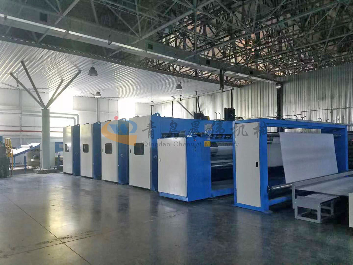 開(kāi)包機(jī)-開(kāi)松機(jī)-振動(dòng)給棉機(jī)-梳理機(jī)-鋪網(wǎng)機(jī)-針刺機(jī)-切邊成卷機(jī)